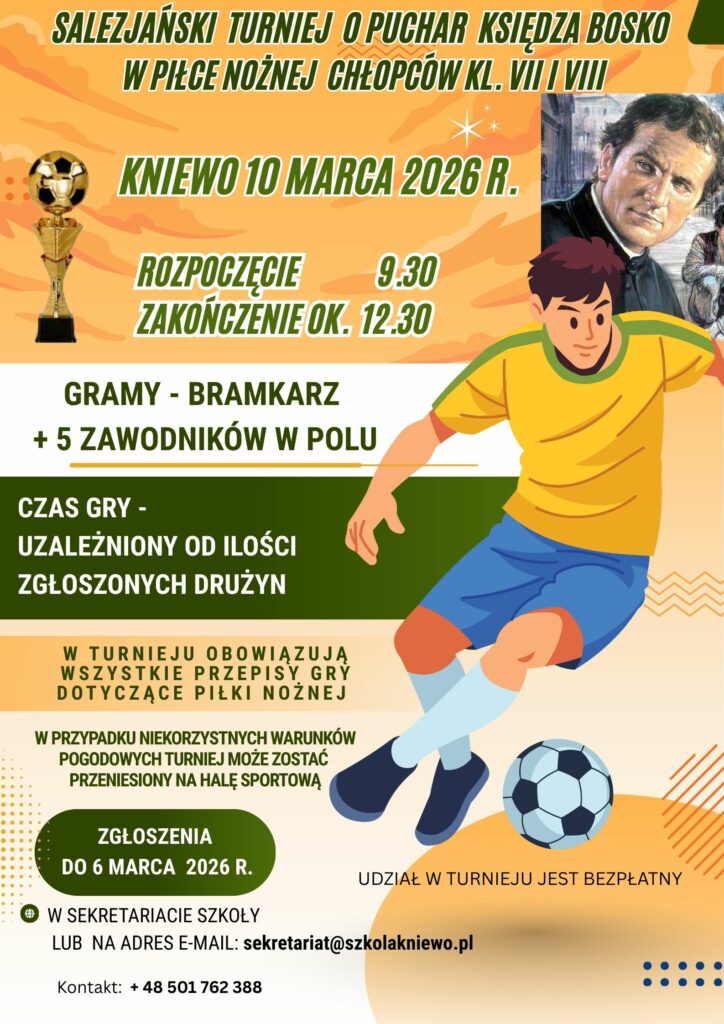 „W dniu 10 marca br. na boisku Szkół Salezjańskich w Kniewie odbył się Turniej Piłki Nożnej o Puchar św. Jana Bosko. W pięknej i radosnej rywalizacji, Puchar św. Jana Bosko wywalczyli uczniowie ze Szkoły Podstawowej w Kostkowie, II miejsce zdobyli Gospodarze, III Miejsce uczniowie ze Szkoły Podstawowej w Jeleńskiej Hucie.